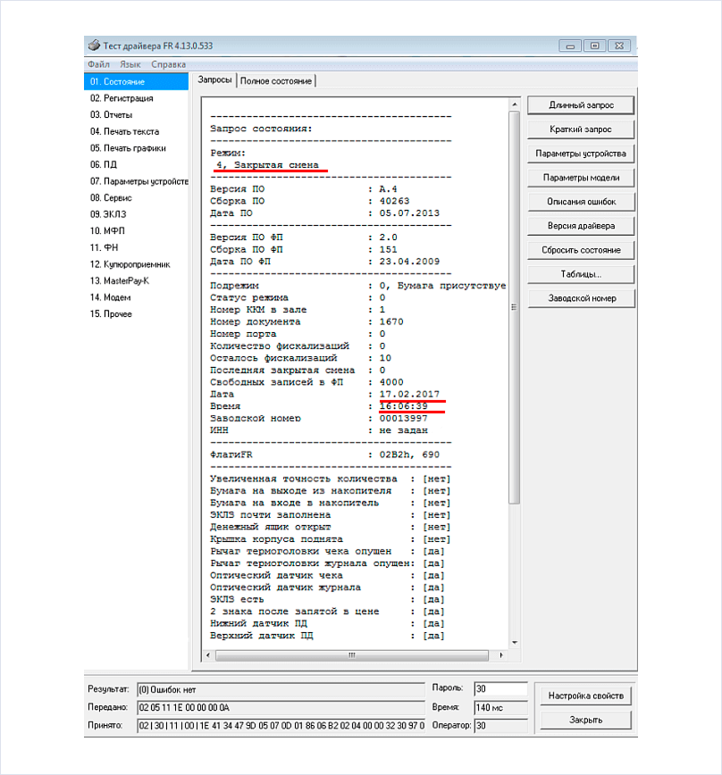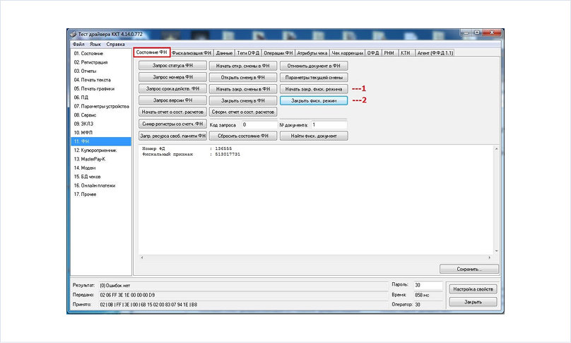 Закрытие архива и активация нового блока выполняются в программе «Тест драйвера ФР» с достаточно сложным интерфейсом (при этом она проще аналогичных решений у касс «Атол» или «Вики Принт»).
