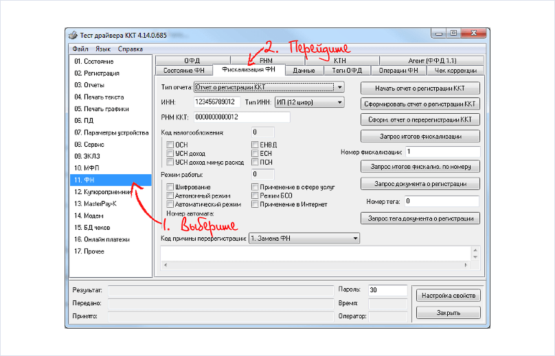 В «Тесте драйвера ФР»: