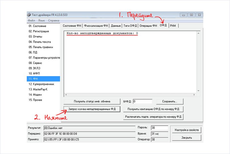 Откройте вкладку «ОФД» и нажмите «Запрос количества неподтвержденных ФД».